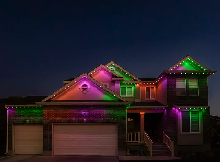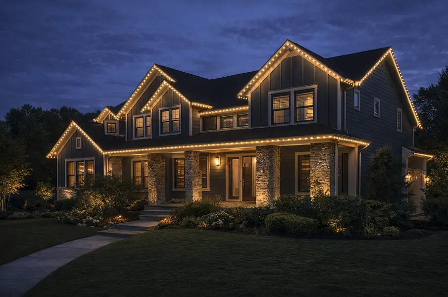 Discreet, fully customizable via app, year-round LED lighting installed along rooflines for holidays, everyday ambiance, and security.