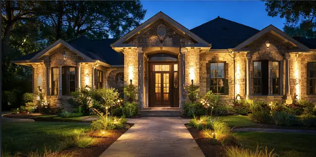 Accentuate stone, brick, columns, and rooflines to showcase your home’s design long after the sun goes down.