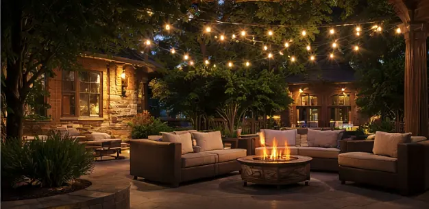 Create a comfortable outdoor living space with subtle lighting perfect for relaxing evenings and entertaining guests.